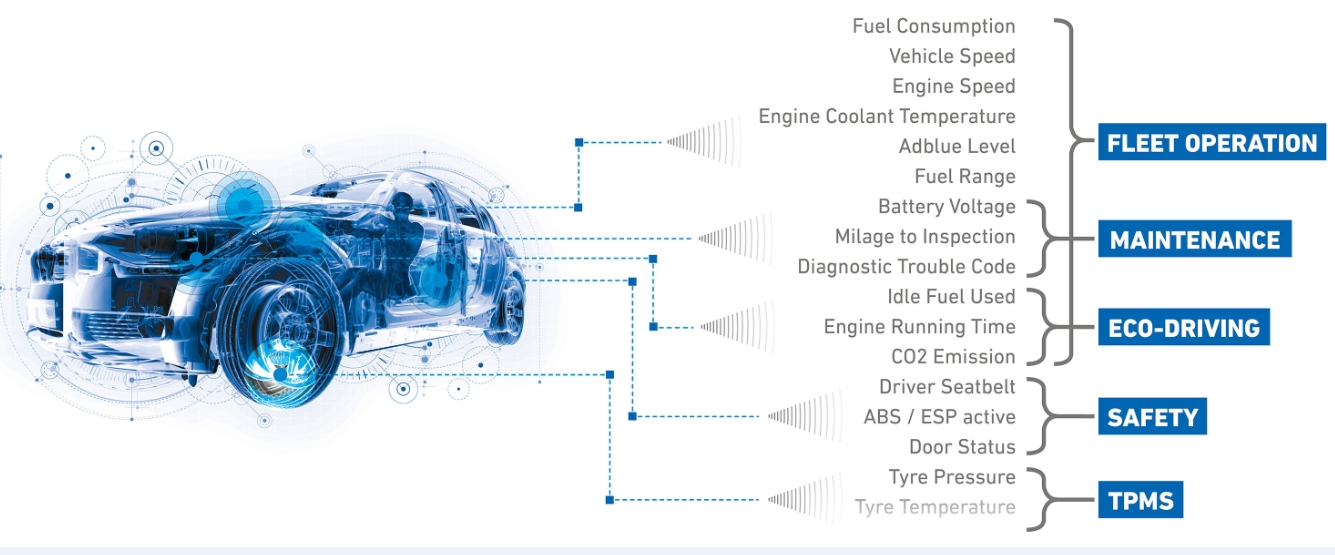 2. Commercial vehicles: fuel consumption, mileage, vehicle speed, oil level, engine speed, idling time, engine coolant temperature